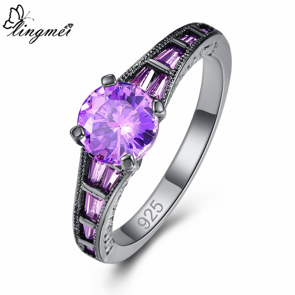 Lingmei Wholesale Wedding Bride Classic Jewelry RoundPurpleRed Zircon Silver Color Black GoldRing Size 6-9