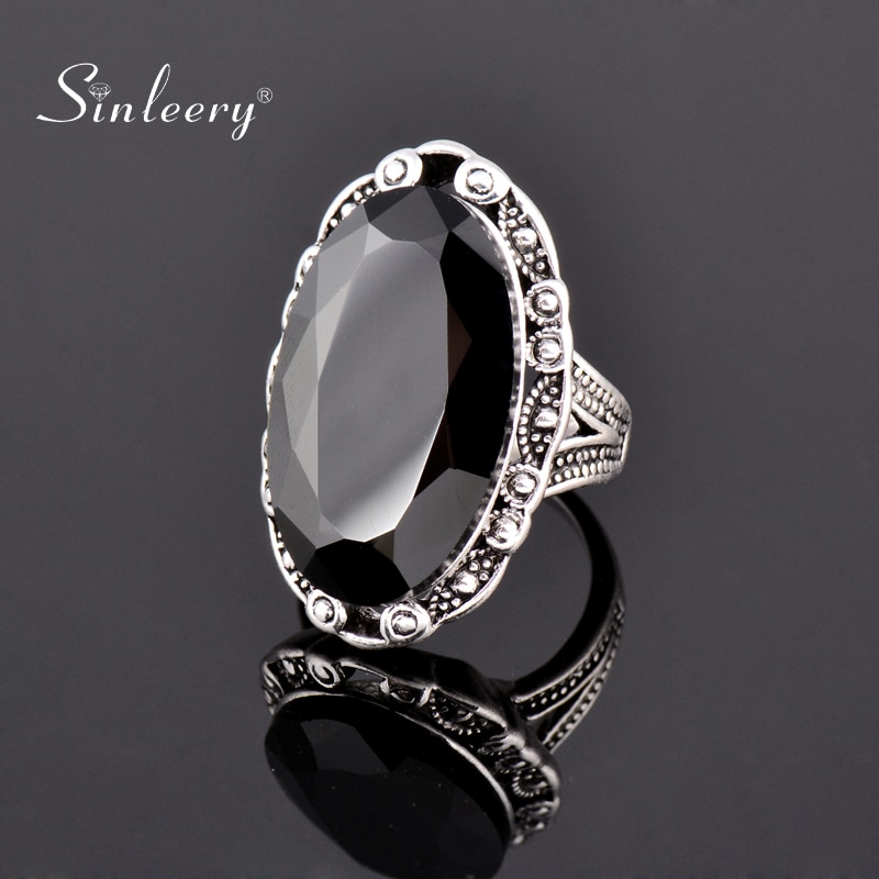 SINLEERY Vintage Big Black Oval Stone Rings For Women Size 6 7 8 9 10 Antique Silver Color Jewelry Anel Jz516 SSF