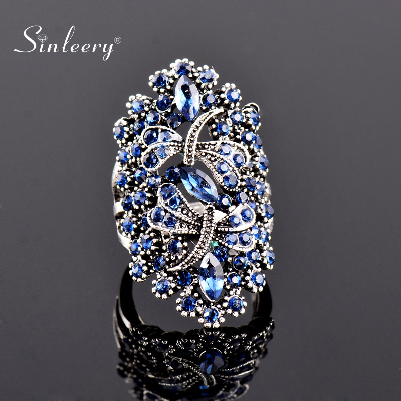SINLEERY Vintage Big Hollow Blue Rhinestone Dragonfly Rings Women Antique Silver Color Wedding Party Jewelry JZ565 SSI